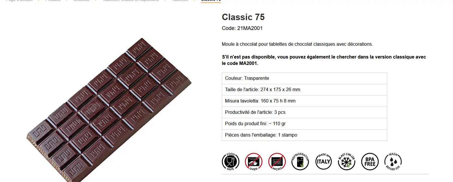 Caractéristiques techniques du moule tablette chocolat