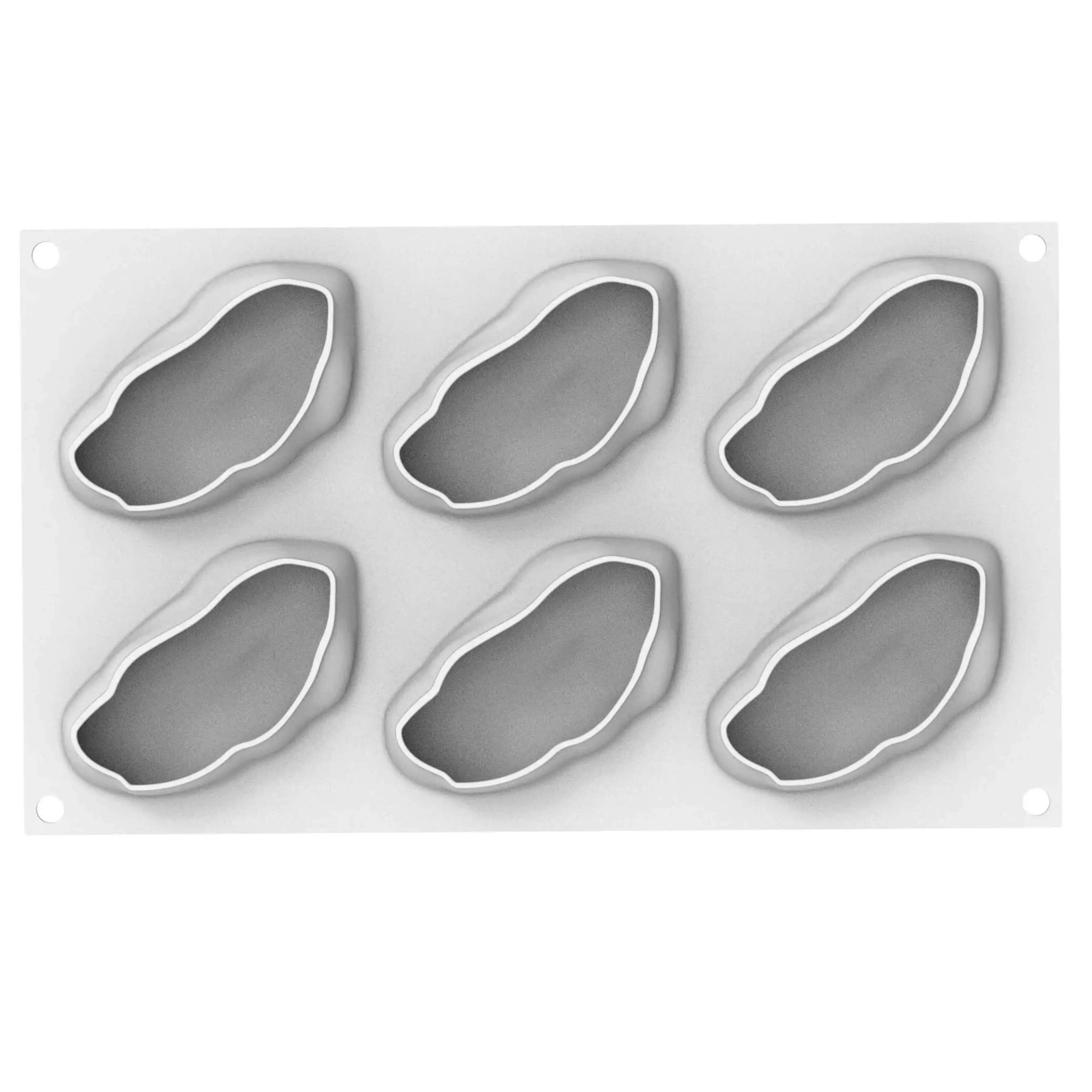 Avec ses 6 cavités de 120 ml, ce moule est conçu pour réaliser des portions individuelles équilibrées. Il permet de travailler des entremets gourmands, mêlant textures croquantes, fondantes et crémeuses. Sa forme allongée et légèrement irrégulière renforce l’effet trompe l’œil, tout en offrant un excellent support pour des montages précis et réguliers en laboratoire.