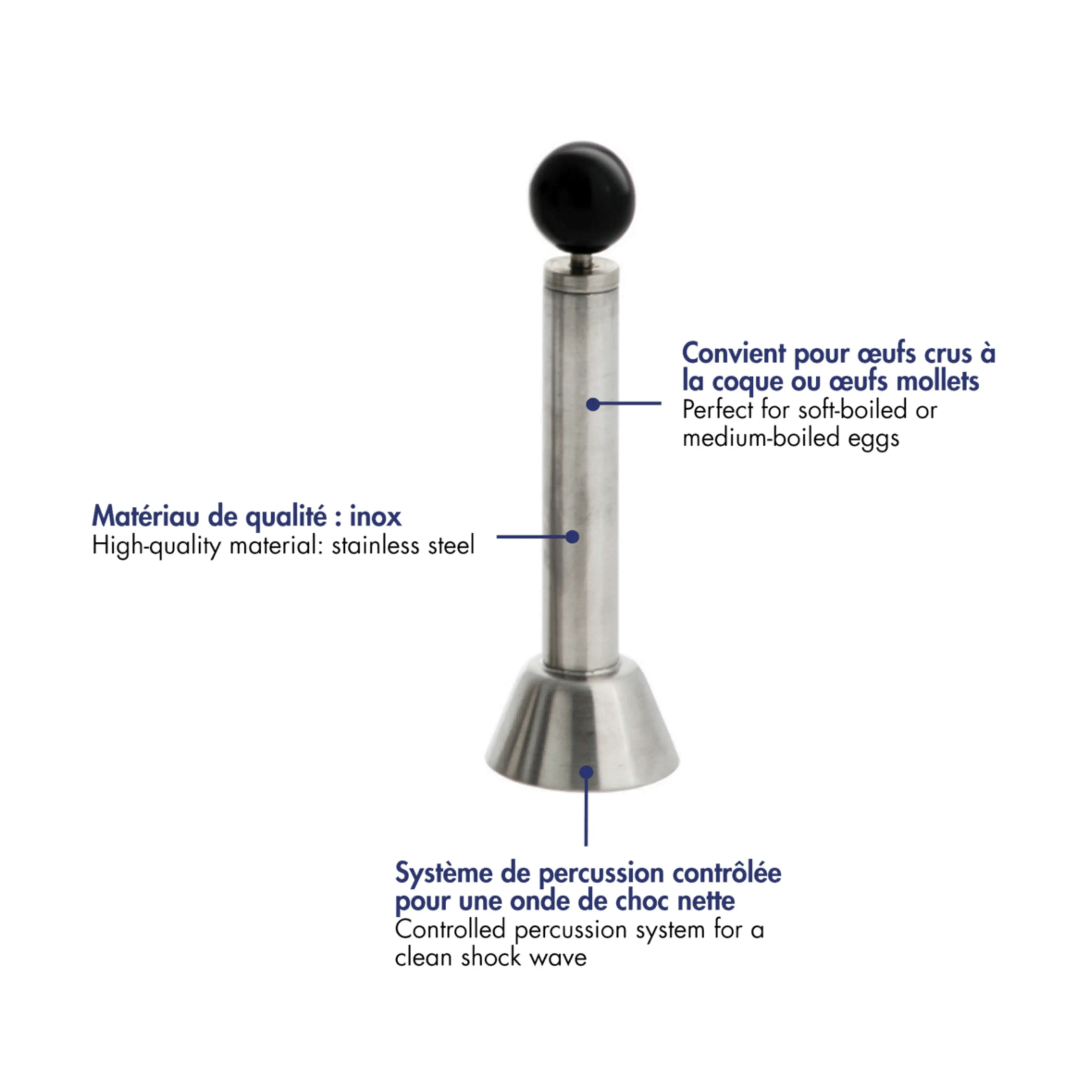 Facile à prendre en main, ce toqueur fonctionne par un système de percussion qui casse la coquille de manière contrôlée. Il suffit de positionner l’outil sur l’œuf puis de relâcher le mécanisme pour obtenir une découpe nette. Ce système permet un gain de temps en cuisine tout en assurant une utilisation accessible, même pour les utilisateurs débutants.